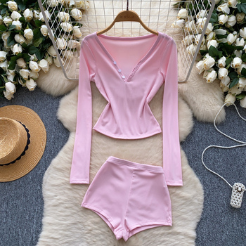 Y2K Sport Conjunto de 2 piezas para mujer Top con cuello en V y pantalones cortos delgados Conjunto de ropa al por mayor